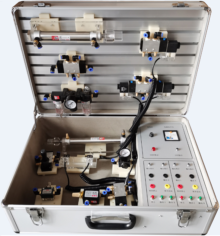 1、實訓箱主要由鋁合金機箱、各種標準氣動工業元件、和電氣控制器件等組成。