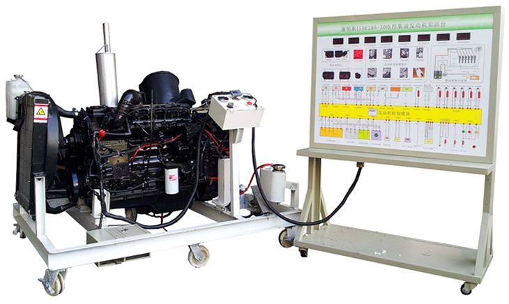 柴油發(fā)動機總成、組合儀表、發(fā)動機控制單元、散熱系統(tǒng)(水箱、風扇、上下水管)、排氣系統(tǒng)、進氣系統(tǒng)(進氣軟管、空氣濾清器總成)、原車電路原理圖板及檢測端子面板、蓄電池、電源總開關(guān)、燃油箱、油水分離器、油門踏板裝置、可移動機臺架、臺架高溫及轉(zhuǎn)動等部位加裝防護裝置等。