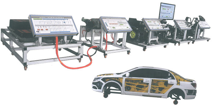 (比亞迪e5 EV300純電動汽車) 鋰動力電池組、電池管理系統BMS、BMS顯示屏(7寸觸摸屏)、維修開關、輔助蓄電池(12V45AH)、高壓配電箱、漏電傳感器、車載充電機、國標充電插座與充電槍、直流接觸器(包含充電繼電器、總正繼電器、總負繼電器、預充繼電器)、急停開關與電源總開關、一體化全鋁合金型材搭建的移動臺架(1500×700×1700mm ,帶自鎖腳輪裝置,帶安裝檢測端子的原理面板1448×940mm)、故障考核系統、設備操作說明書。